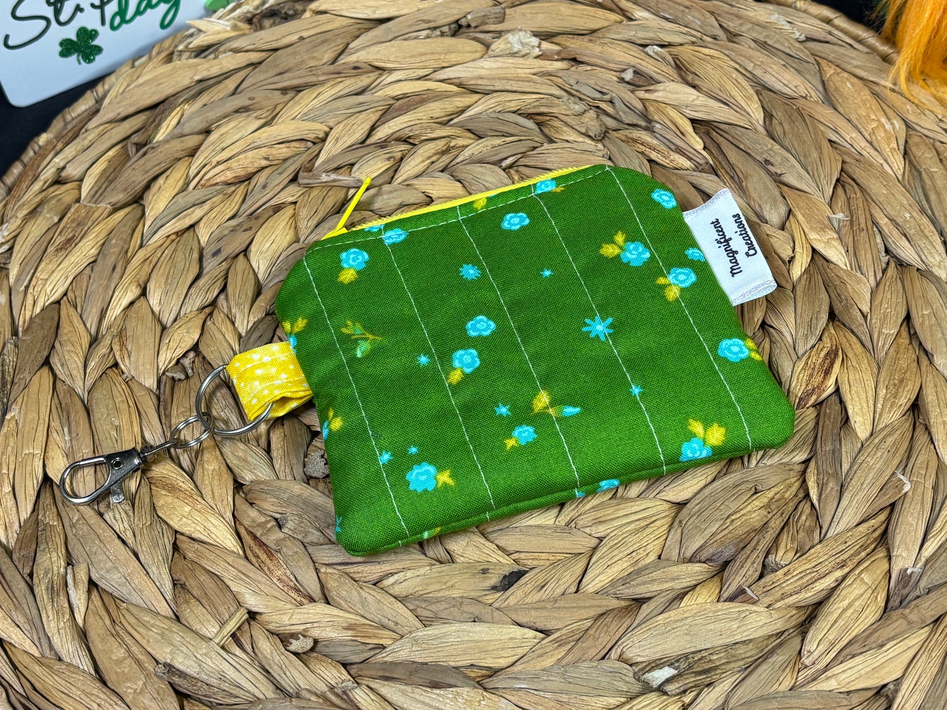 Brighten up daily routines with this hand‑quilted mini keychain wallet. Designed for compact convenience, it attaches directly to your keys or handbag and tucks comfortably into a pocket. With space for cash, coins, a chapstick and small essentials, this wallet keeps your most-used items within easy reach.
